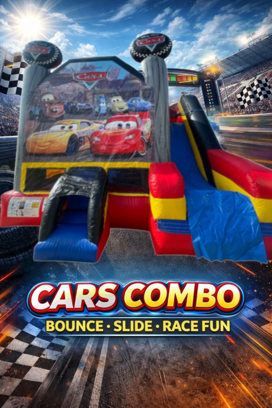 Start your engines! The Disney Cars Combo brings the high-speed fun of Radiator Springs right to your next event. Featuring fan-favorite characters like Lightning McQueen and Mater, this officially licensed inflatable is perfect for little racers and Disney fans alike.