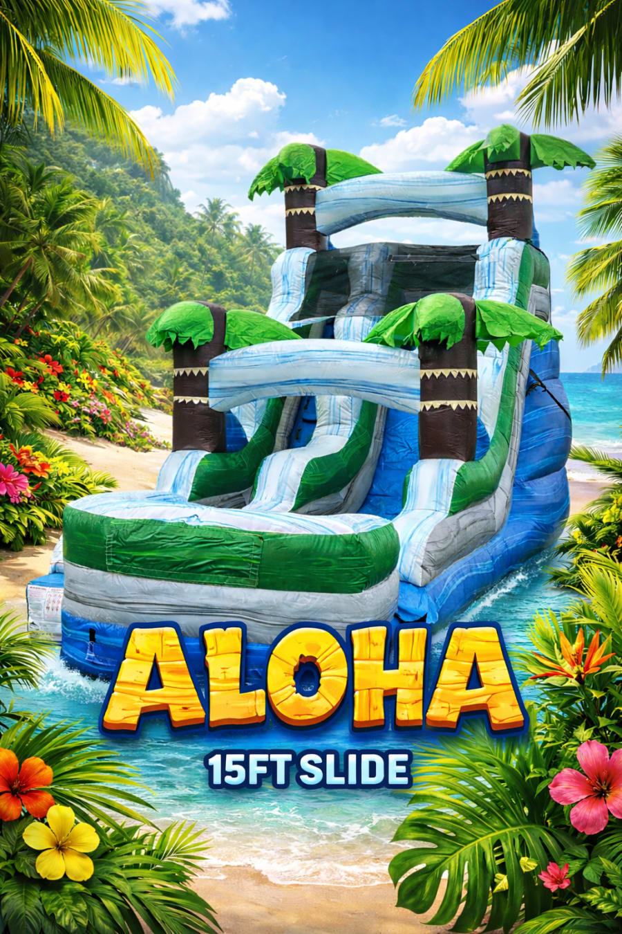 Bring the spirit of the islands to your party with the Aloha Slide! This vibrant 15-foot tropical-themed slide features lush palm trees and bright colors that make every event feel like a beach vacation. Perfect for kids and adults alike, the Aloha Slide delivers refreshing wet fun in the summer or exciting dry play anytime.