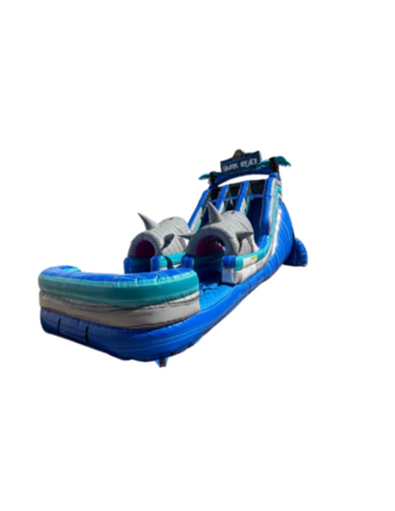 This towering dual-lane slide lets two riders race side-by-side straight into the gaping mouths of two giant great white sharks—creating an epic finish they’ll never forget! With its bright ocean colors and high-energy design, Shark Beach brings beach vibes and thrilling action to any event.