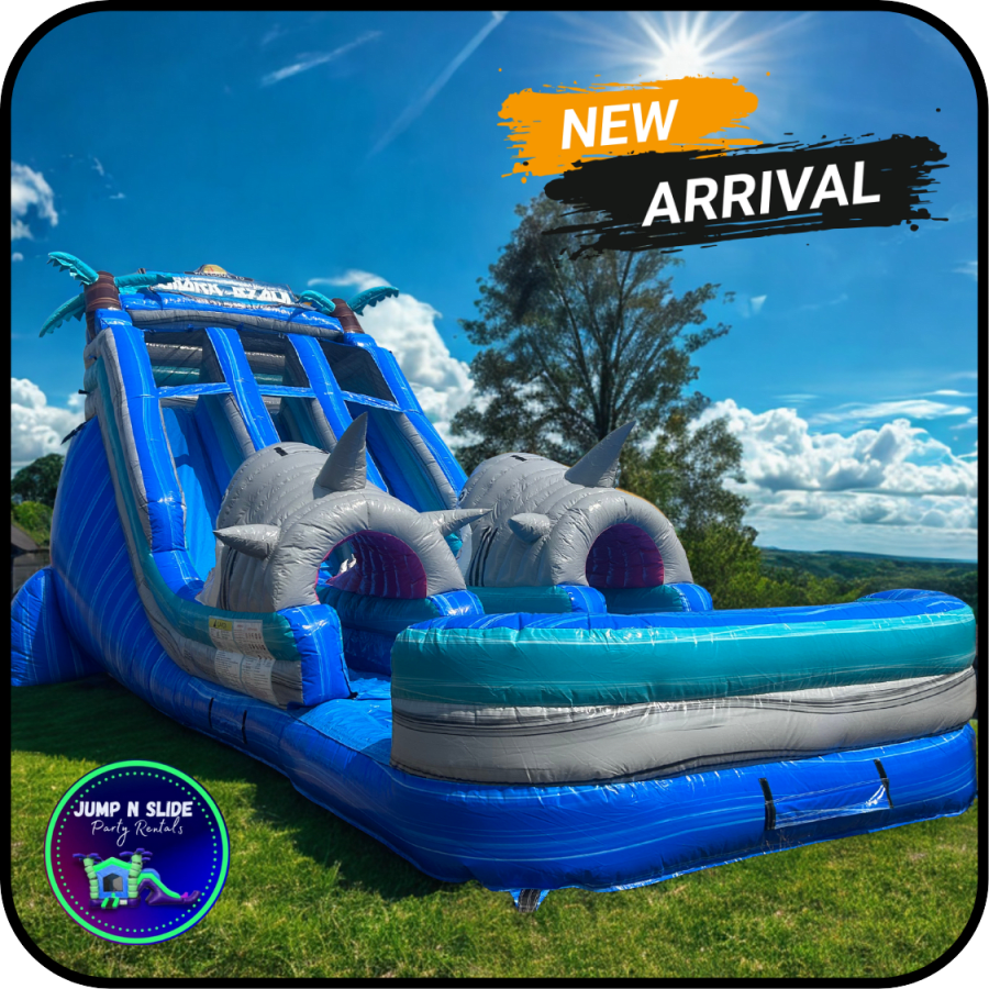 This towering dual-lane slide lets two riders race side-by-side straight into the gaping mouths of two giant great white sharks—creating an epic finish they’ll never forget! With its bright ocean colors and high-energy design, Shark Beach brings beach vibes and thrilling action to any event.