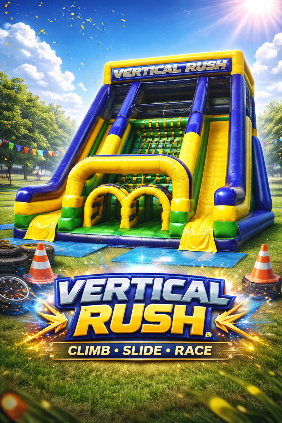 Ideal for dry use only, the Vertical Rush combines the excitement of an obstacle course with the speed of a slide—all in a space-saving footprint. Whether you're planning a school field day, team-building event, or just want to crank up the energy at a birthday party, Vertical Rush delivers non-stop action.